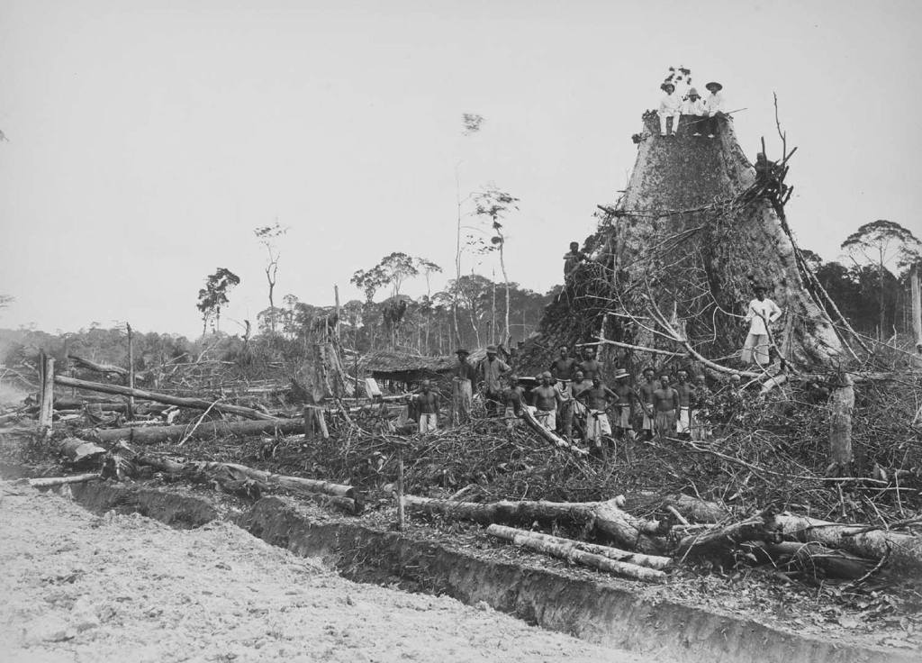 He looks up, takes his ax, which is lying next to him, and says in broken Malay: “Kaloe mau potong, potong la sendiri!” (If the piece has to be cut, cut it yourself).