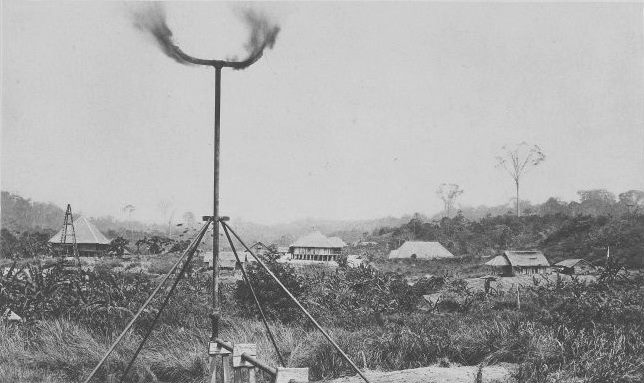 “… on a tour of inspection of the tobacco fields, he was overtaken by a storm and sought refuge in an abandoned tobacco shed where a not too comfortable night was spent. The mandur who accompanied hirn, an inhabitant of the district, lit a torch to dispel the darkness. Zijlker’s attention was drawn to the peculiar bright flame and, convinced that he had to do with a particularly resinous kind of wood, he asked the guide how he had come by this toreh. The man explained that the torches were daubed over with a kind of mineral wax, which from time immemorial, had been used in the district for many purposes, such as the caulking of boats. They used to skim it off the surface of small pools to be found in the neighborhood. Zijlker’s curiosity was aroused, and the next morning he got the man to take hirn to one of these locations. He was quick to recognize the smell of kerosene, which had been introduced in the Archipelago a few years back. Zijlker collected a little of the muddy substance and sent it back to Batavia to be analyzed. This was in 1880. Examination and distillation of this already very evaporated oil yie1ded a 21.2% of first-rate illuminating oil at a temperature between 130 and 180 degrees centigrade; 28% between 180 and 225 degrees; and 10% between 225 and 240 degrees, or a total of 59.2%. A later specimen yielded even 62% excellent lamp oil (together with 15% gasoline).”