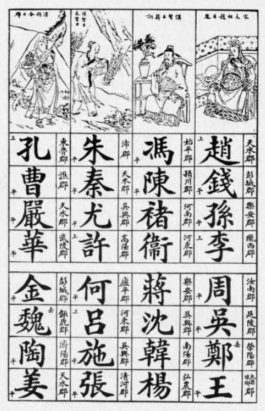 characters, each of which indicates a “hsing”. With each of those names are in the same box in the corner a little sign, to indicate in which tone the word should be pronounced and next to it is stated from which district the tribe comes is and what the meaning is. At the top of the page are four people