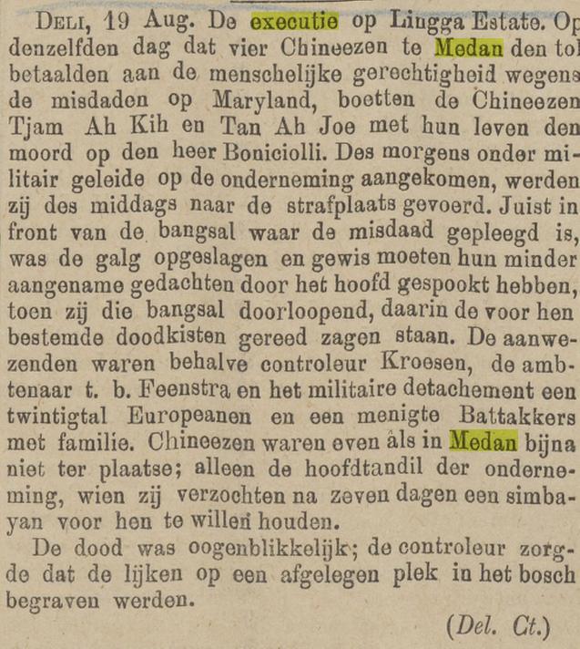 A terrible murder is on a farm was committed in Deli on Mr. Giovani Boniciolli (who was just 18 years old), who had been employed in Lingga estate for three years. Without suspecting anything bad, he entered the barn in the morning of the 23rd of August 1884, as usual accompanied by the Chinese mandor, to receive tobacco.