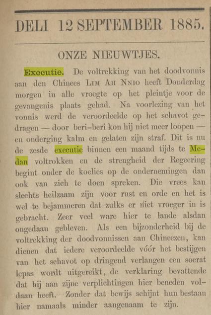 Execution. The execution of the death sentence to the Chinese Lim Ah Nnio has Thursday early in the morning on the square in front of the prison took place. After reading the verdict, the condemned was placed on the scaffold wear – because of beri-beri he could no longer walk – and met his punishment calmly and resignedly. This is now the sixth execution within a month at Medan accomplished and the severity of the Government starts among the coolies at the companies then