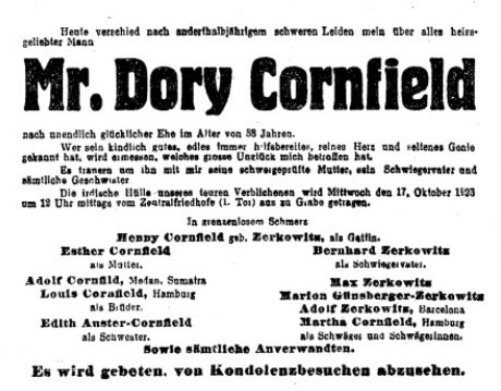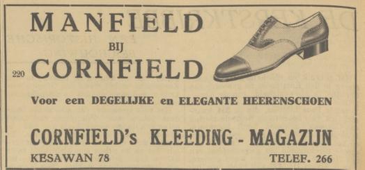 Cornfield’s Stores always hold as complete a range of cloths as the average European tailor, and the chief cutter is quite a clever expert. The present proprietors are Messrs. . A. L. and E. Cornfield, sons of the founder of the firm. In addition to the premier business, Cornfield’s Stores also conduct a considerable trade, in gold, silver, and bronze goods, household furniture, lamps, and pictures.