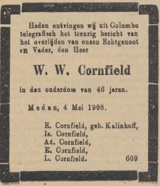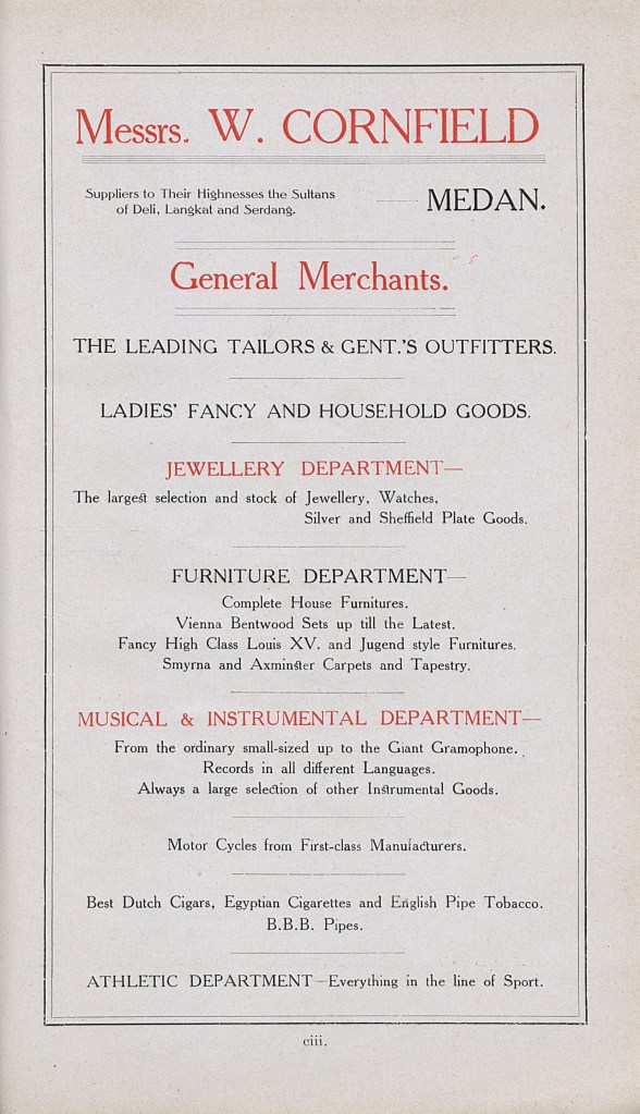 The most important tailoring and outfitting establishment in Medan is that of Cornfield Bros., established in 1892 by the late Mr. W. Cornfield. The best customers in the town go to Cornfield’s, and among the firm’s patrons are the members of the family of the Sultan of Deli. The principal buying agents in Europe are Messrs. Alexander Young, Ltd., London, and Dormenil Frères, of Paris and London.