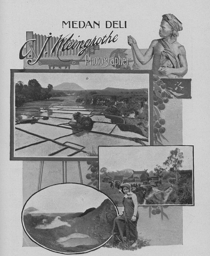 Tourists or visitors to Medan, desirous of securing some memento or souvenir of the district are recommended to visit the atelier of Mr. C. J. Kleingrothe, where a selection from the numerous beautiful post cards and photographic prints will prove a difficult task. Special attention must be drawn to albums of Sumatra and the Straits Settlement, which, for artistic value, variety of subject and high-class production, are unsurpassed. Atelier Kleingrothe is patronised by the Sultans of Deli and Langkat and the leading citizens of Medan, their portraits being of undoubted merit.