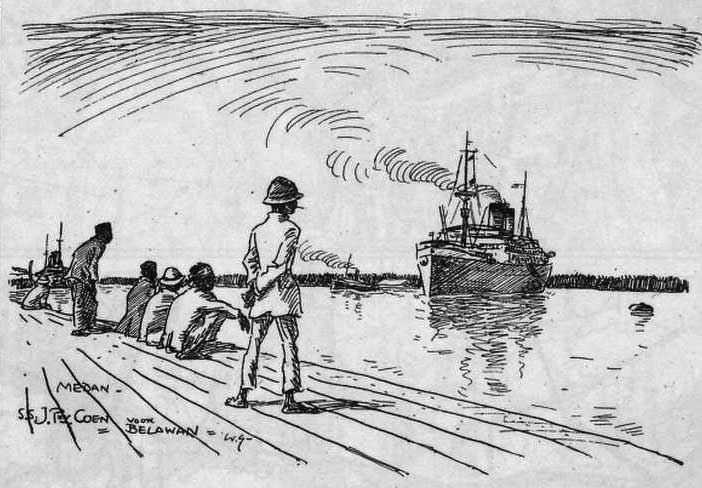 This is the arrival at Deli, in the year nineteen hundred and thirty-five. Fifty years earlier. We are writing March 18, 1895. The new mail boat, the “Prins Alexander”, which, when it arrived in the East, attracted general admiration for its steam power, brought us to Riouw. There we switched to the ‘Siak’ of the Dutch Ind. Stoomboot Mpij. A small boat of 200 tons with a machine of 80 horsepower, which brought us to Laboean via Bengkalis, Siak and Asahan, almost only to get the post. Unless we came to Penang by English mail boat and made the crossing from there on the small coastal boat and sailed directly to Deli. The captain, who is an experienced sailor on these shores, waits in front of the bank at high tide , because even if our ship crosses too narrowly 5 feet, without the tide we cannot cross the coast bank. In the distance we only see the comfortless beach woods and rhizophores. Incidentally, not a single sign of life, not even kampongs, which are scanty as they are, situated higher up on the rivers to be protected from flooding. Then the coast narrows to the mouth of the river.